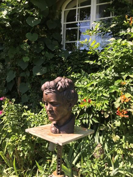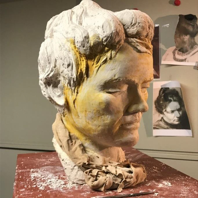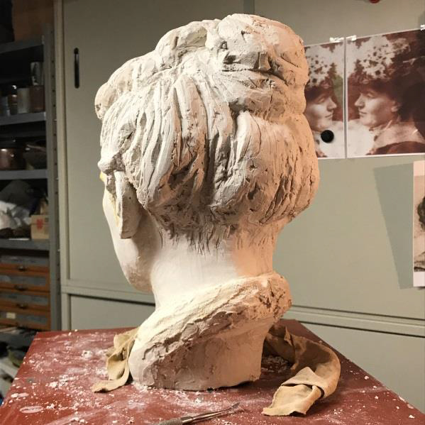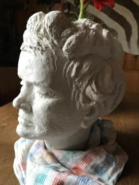 Es war das erste Mal, dass ich nicht nach einem lebenden Modell gearbeitet habe, sondern auf diverse Fotos zurückgegriffen habe. Vom Alter her habe ich mir vorgestellt, die Mia zu wählen, die voller Tatendrang das Heim in Gaienhofen für sich und ihre Familie geschaffen hat. Die leicht nach unten gesenkte Kopfhaltung habe ich so gewählt, da ich die Melancholie der Mia in ihrer letzten Zeit in Gaienhofen zum Ausdruck bringen wollte.