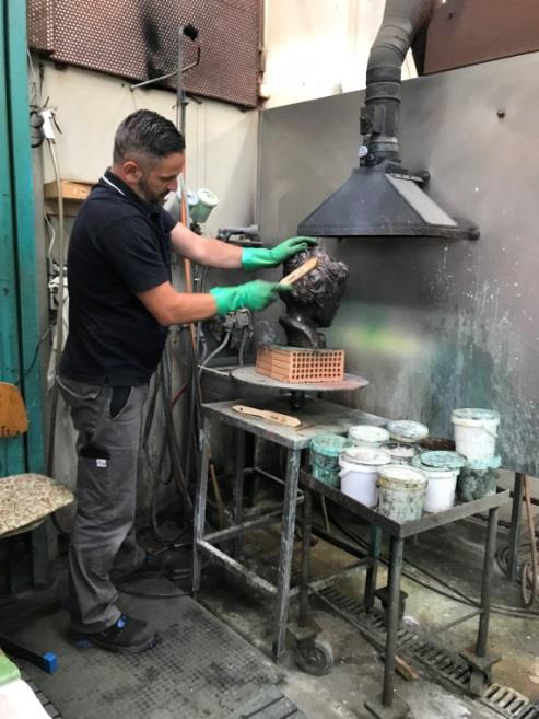 Das Kunstobjekt wird zunächst für einen genau festgelegten Zeitraum in ein Patinabad (mit Schwefelleber) getaucht. Dann werden von Hand weitere Patinierlösungen aufgetragen und mit der Gasflamme eingebrannt. So lassen sich jeweils ganz besondere Farbnuancen und Schattierungen erzielen, um den Charakter und die Ausstrahlung des Kunstwerks zu intensivieren.