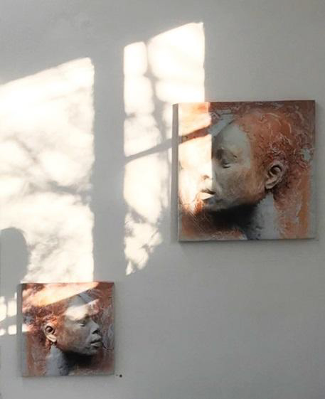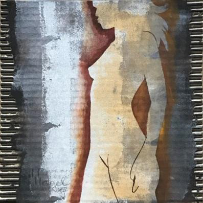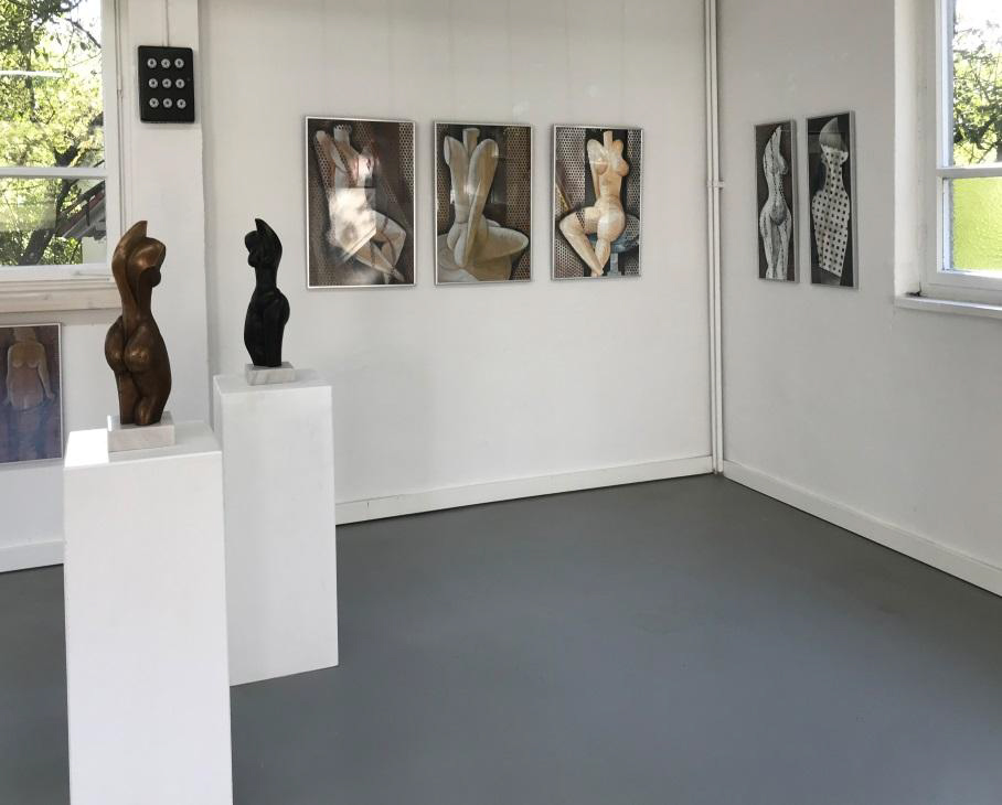 Maria hat mir im Herbst letzten Jahres eine ihrer Boxenluder zugesteckt. Und für mich war klar: Das war der Start in eine neue Schaffensphase – eine weitere Auseinandersetzung mit dem weiblichen Körper. Und auf der Plattform der zunächst kleinformatigen Bilder entstanden größere Arbeiten im Quadrat, dann aber auch – der Körperform angepasst – die schlanken Hochformate, präsentiert hier an der Außenwand und nahe der beiden Christine-Torsi. Auch da entdecken wir Mischtechniken auf Wellpappe, die teilweise vorab gerupft wird, um so Farbe einarbeiten zu können, was entsprechende Schattierungen hervorruft. Andere Arbeiten sind gespachtelt und wirken durch die Dichte des Materials.