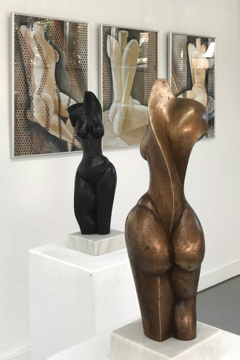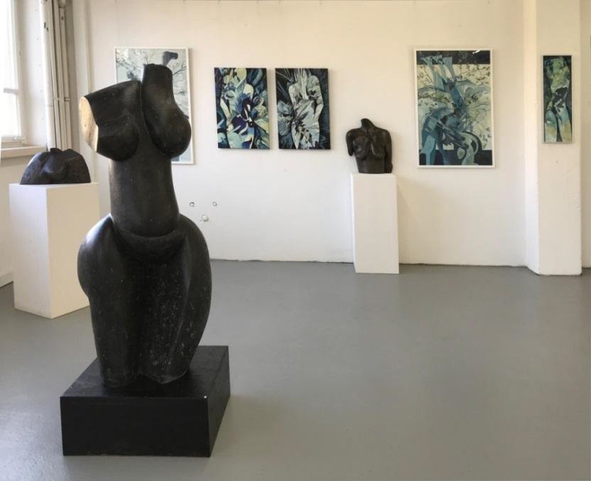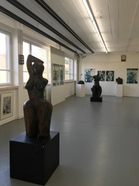 Bleiben wir zunächst bei den plastischen Arbeiten: Da nehmen die Großplastiken Raum ein und beherrschen die Szene, sobald wir durch die Eingangstür gehen – zumindest wenn der Ausstellungsraum so gut wie menschenleer ist. Im vorderen Bereich entdecken wir die Darstellung einer von Mythen und Geheimnissen umgebenen Nymphe – ein Objekt, welches bei der Jahresausstellung in der Galerie Tuttlingen 2017 bereits präsentiert wurde. Die erste Bronzestatue von diesem Typus steht seit 2016 in einer Schloss- und Gartenanlage in Südfrankreich – traumhaft integriert und mit Blick auf das Mittelmeer. D.h., diese Nymphe Nr. 2 ist noch zu haben, falls Sie ein ähnlich adäquates Plätzchen für sie hätten!