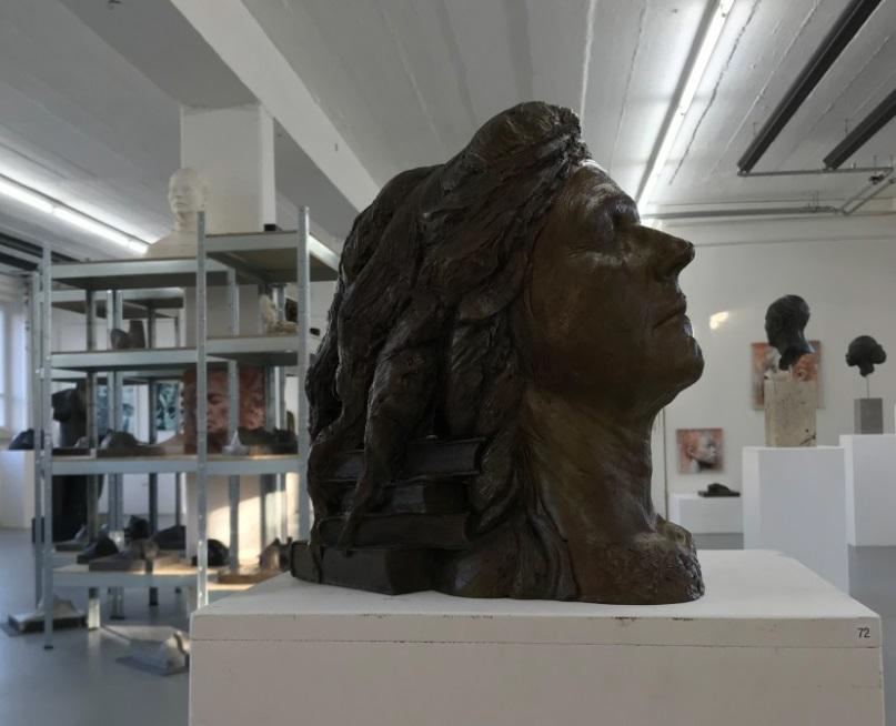 Immer wieder ein Exponat der besonderen Art ist für mich der Bronzeguss mit dem Titel "Buchhändlerin". Zwei Aspekte sind es, die mich bewegen, näher darauf einzugehen. Zum einen zeigt uns die Arbeit, wie MM vorgeht bzw. wie sie zu ihren Werken kommt. Denn diese Buchhändlerin gibt es tatsächlich – und sie übt diesen Beruf ganz in der Nähe auch aus. Am Anfang steht also eine reale Begegnung der Künstlerin MM mit einem Menschen: ein Ausgangspunkt, der Ideen freisetzt und einen künstlerischen Prozess in Gang setzt, ohne genau zu wissen, was am Ende dabei herauskommt. Und der weitere Grund, weshalb ich näher auf das Werk eingehe: Immer dann, wenn es bei der künstlerischen Umsetzung neben allen personenbezogenen Aspekten um die Darstellung von Typen und Gattungen geht, spielen Attribute und Bilder eine wesentliche Rolle. In diesem Falle sind es Bücher, die aufgestapelt liegen, der Kopf der Frau ist leicht nach hinten geneigt, der Nacken ist an den Bücherstapel angelehnt und die langen Haare umschließen diesen teilweise. Die Augen sind geschlossen.
