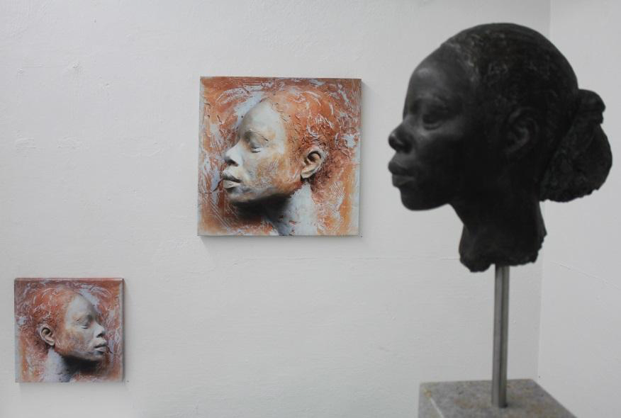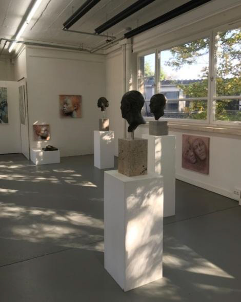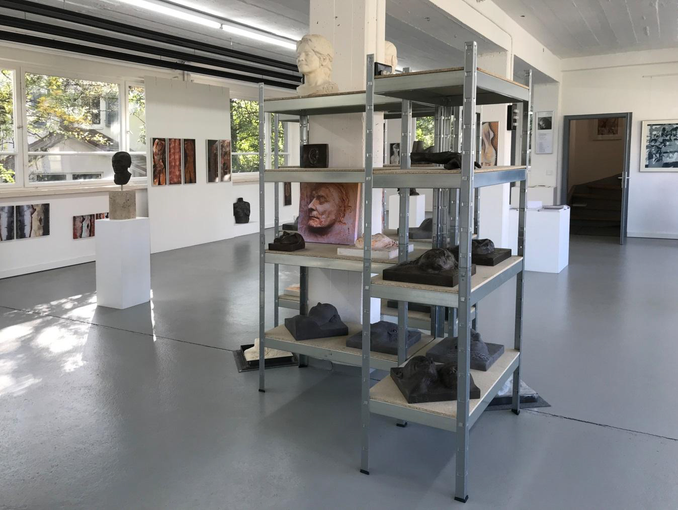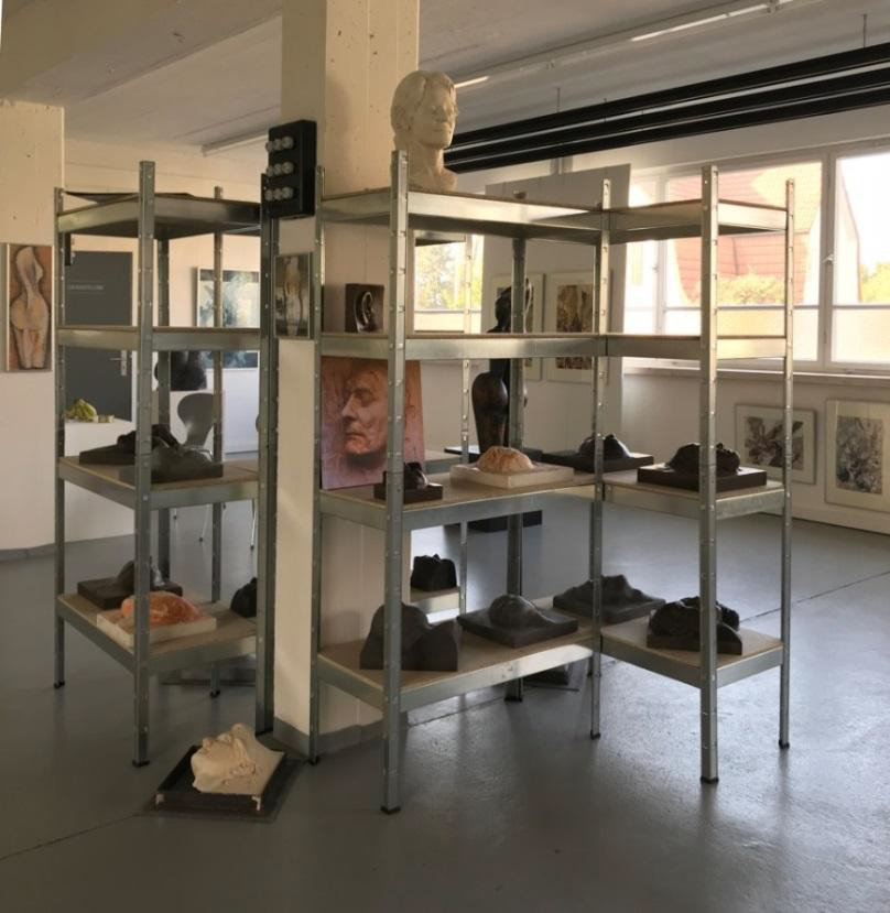 Nach diesem kleinen Exkurs aber nun weiter zu den Elementen dieser Ausstellung: Aus der Kategorie der Objektkunst entdecken wir die "Große Schulter" im Eingangsbereich und als Pendant ein weiteres Exemplar in der hinteren Ecke des Raums. Wir stoßen auf Reliefs mit Halbakten, die sich harmonisch in die Bilderzyklen eingliedern, wir registrieren eine stattliche Anzahl von Kopfsteinen in unterschiedlichen Versionen – konzipiert als Installation und platziert in einem Regal, das zur Konzeption dieser Ausstellungsstätte, einem ehemaligen Industriebetrieb, hervorragend passt und welches 6 unterschiedliche Blickwinkel auf die einzelnen Exponate ermöglicht. Nebenbei: Was mich erfreut und die männlichen Besucher sicherlich auch, das ist die Tatsache, dass bei den Kopfsteinen und Köpfen es auch Männer geschafft haben, in die von femininem Flair geprägte Ausstellung aufgenommen zu werden.