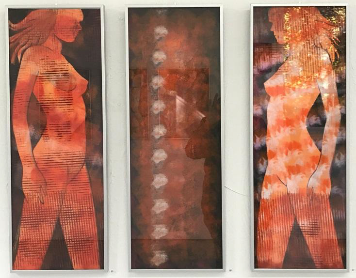 Und eine weitere Machart darf nicht fehlen: Drucke auf Leinwand, die teilweise nachträglich bearbeitet wurden. Aufgelockert wird die Serie durch Motive, die mehr an Anatomie und Röntgenaufnahmen erinnern. Aber eine stilisierte Wirbelsäule lässt sich eben gut mit dem Körper einer schlanken Frau zu einem harmonischen Ensemble zusammenfügen.